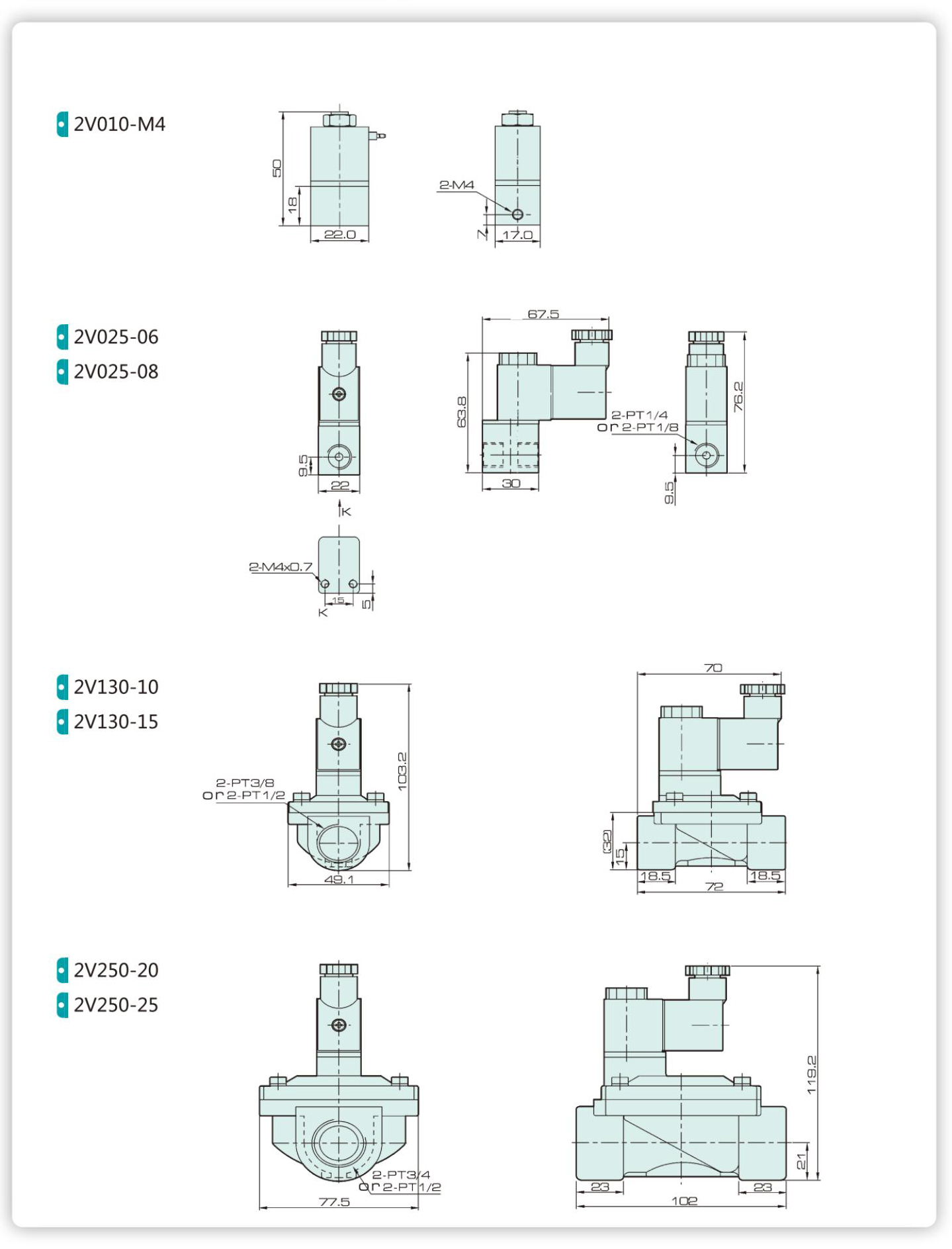 | Model | 2V010-m4 | 2V025-06 | 2V025-08 | 2V130-10 | 2V130-15 | 2V250-20 | 2V250-25 |