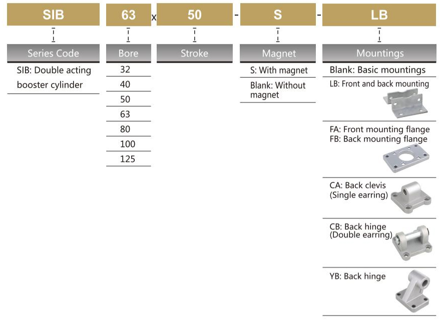 Die SIB -Serie -Booster -Zylinder ist die Kombination von zwei IS015552 Standardzylinder, die die gleiche Bohrungsgröße und den gleichen Schlaganfall haben. LTS -Push- und Wiederherstellungskraft ist zweimal des Standardzylinders. Zwei Zylinder sind durch die Verbindungsbasis verknüpft, deren Material mit dem Zylinder das gleiche ist.