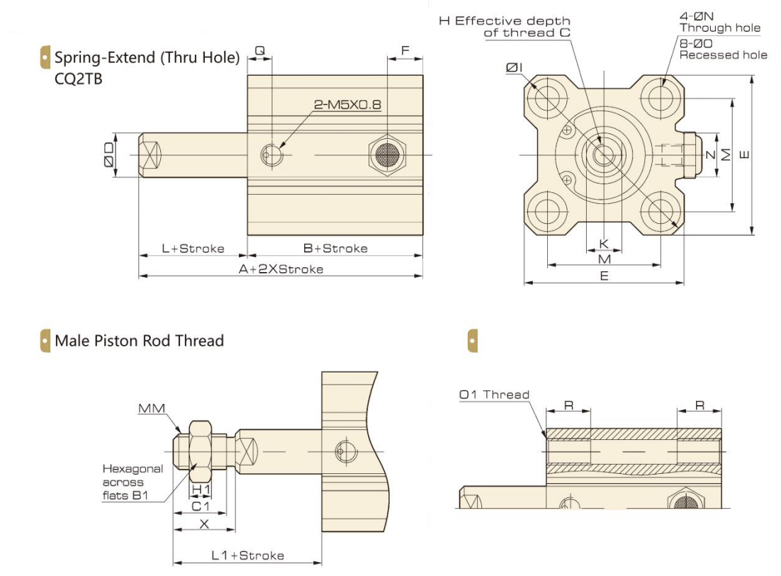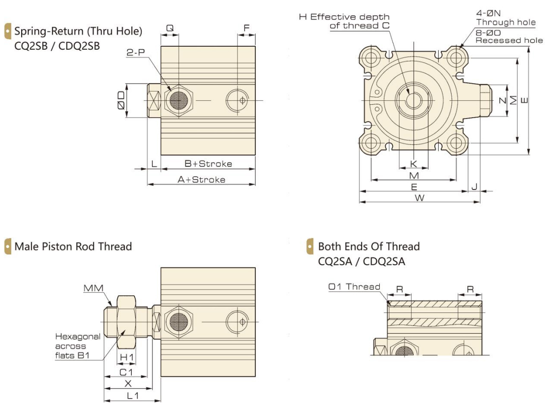 | Einfache Wirkung mit Federrückstellung (Spring-out) / Einfache Wirkung mit Federvorspannung (Spring-in) | - | ||||||||||